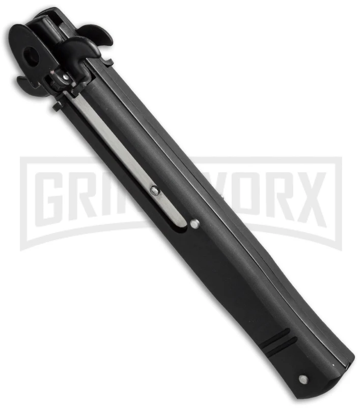 Made by AKC, the Leverletto features excellent workmanship and reliable action. Designed by master craftsman Bill DeShives, the new tactical design has a 4″ bayonet blade and a heavy duty aluminum handle. When you press the lever release, the blade fires into locked position with incredible speed. The AKC Tactical Leverletto is certain to be an impressive addition to your Italian collection! This Leverletto has a black handle and a satin finished blade with a flat grind and a plain edge.
