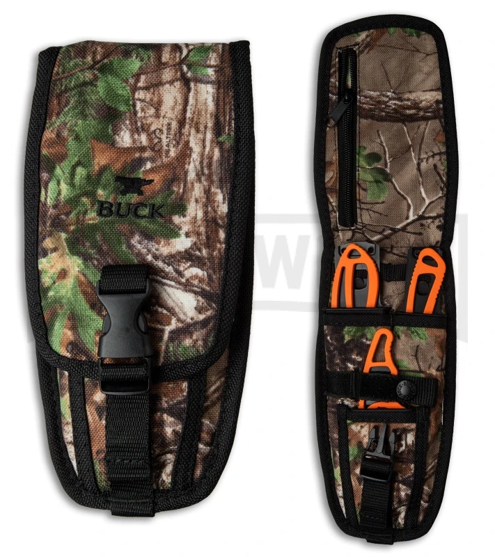 When weight counts, the Buck Field Master Set allows you to pack light, and cut easy. This set contains an orange traction coated 141 PakLite Large Skinner, 135 PakLite Caper and 499 PakLite Guthook. The knives are easily carried in a lightweight, “Realtree Extra” green camo sheath. For easy cleaning the sheath is built with removable liners. With the liners removed, the nylon sheath is washable. Zipper pockets are included in the sheath for carrying tags and other necessary items. The back of the sheath has an adjustable belt strap for comfortable EDC. All hunters and backpackers will appreciate the convenience of having three knives on them for the weight of one!