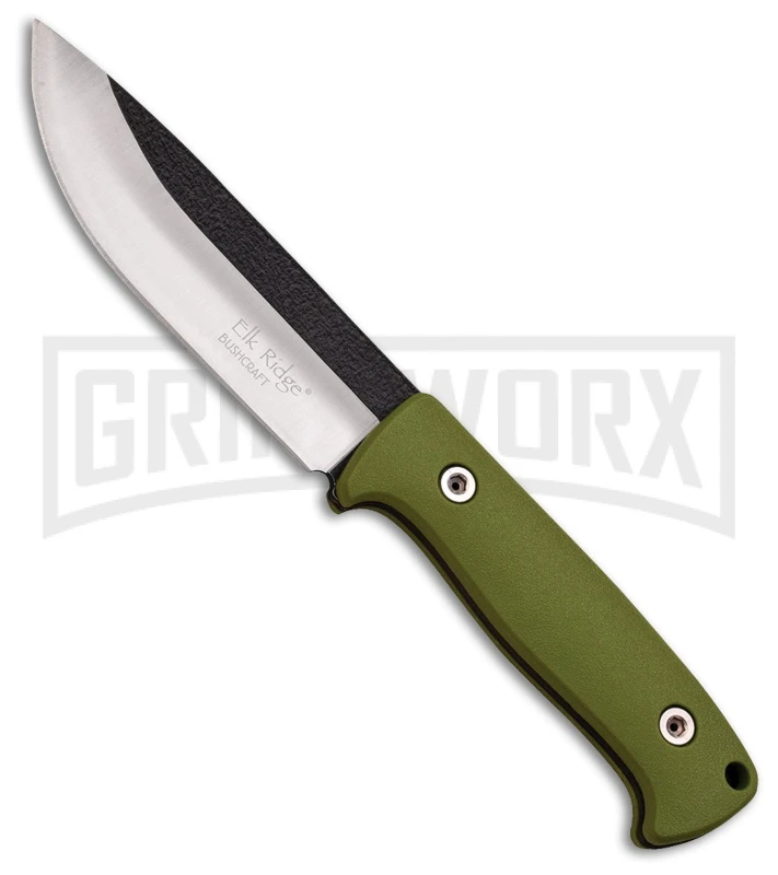 The Elk Ridge Backwater is a fixed blade knife for camping or hunting. The stainless steel blade has a two-tone finish and full tang construction. The handle is green GFN with a lanyard hole. This item comes with a nylon sheath, survival kit and 550 paracord.