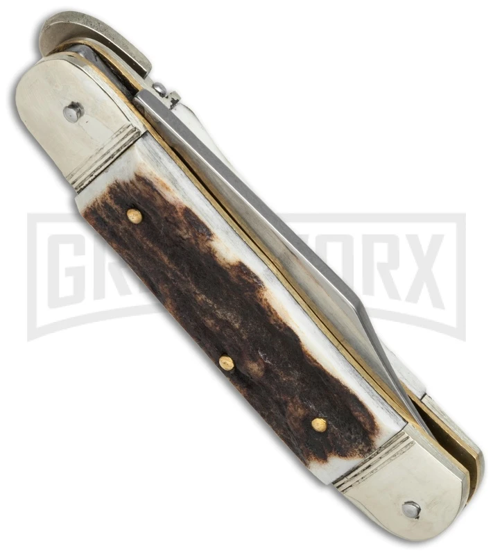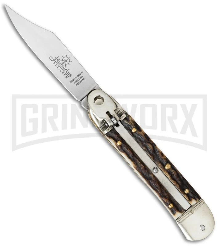 This conveniently sized lever lock automatic knife was handcrafted in Solingen Germany. It features rugged stag horn handle scales with nickle silver bolsters and lever lock. The stainless steel blade comes in a clip point style with a polished mirror finish. Brass pins and liners provide a sturdy framework while adding to the classic look of the knife.