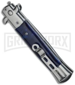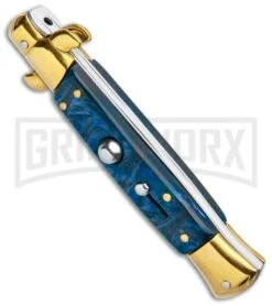 Milano 9″ Italian Stiletto Blue Swirl Automatic Knife – Bayonet Gold