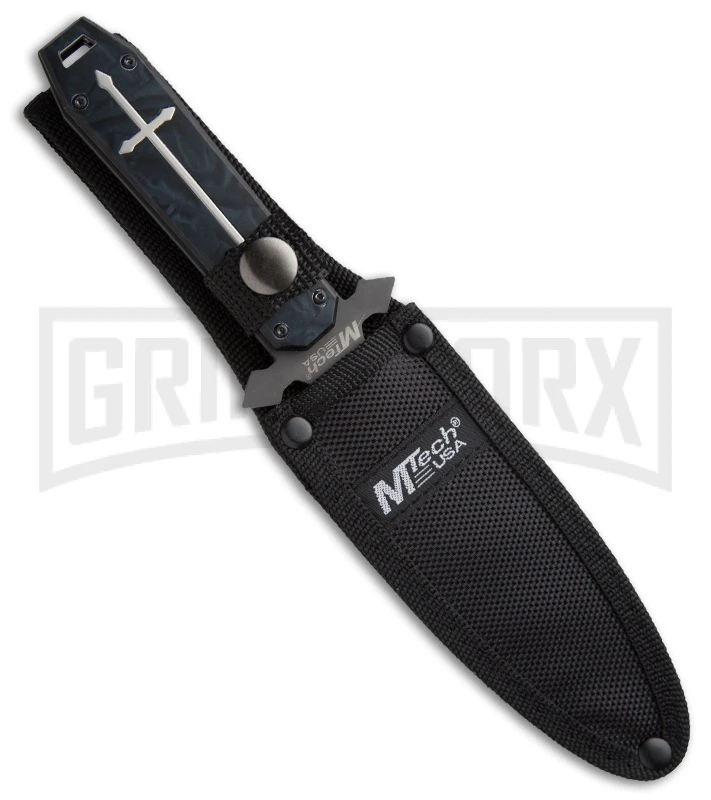This M-Tech Gothic Knifeskull Dagger features 440 stainless steel with a bead blast finish from tip to butt. The double-edge dagger features a subtle skull graphic overlay and cross guard. The handle features blue polypropylene scales with a silver cross and a lanyard hole. USA design.