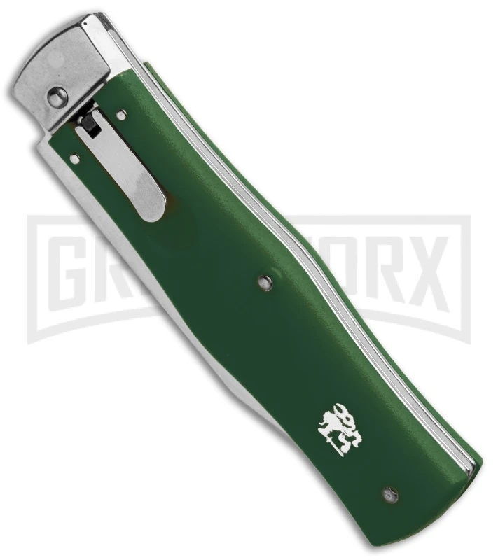 The Mikov automatic knives come from the Czech Republic. This Predator model features green ABS scales and a clip point-style stainless blade. The Mikov series is well-regarded for their “ready to work” no nonsense design. The knife is opened using the small lever near the top of the knife. The lever rests flush in the handle when not in use.