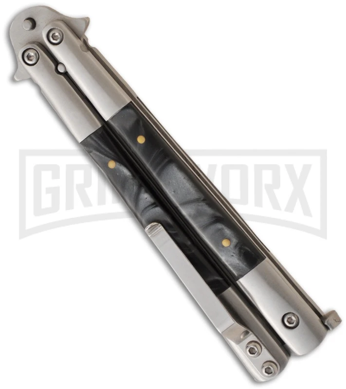 The Regal Flipper butterfly knife has solid, smooth action. It features bolstered steel frame handles with black swirl acrylic inserts and a pocket clip. The 440 stainless steel clip point blade has two tang pins, which results in tighter lock-up and less blade wear. The knife is constructed with Torx screws for easy adjustment of the knife.