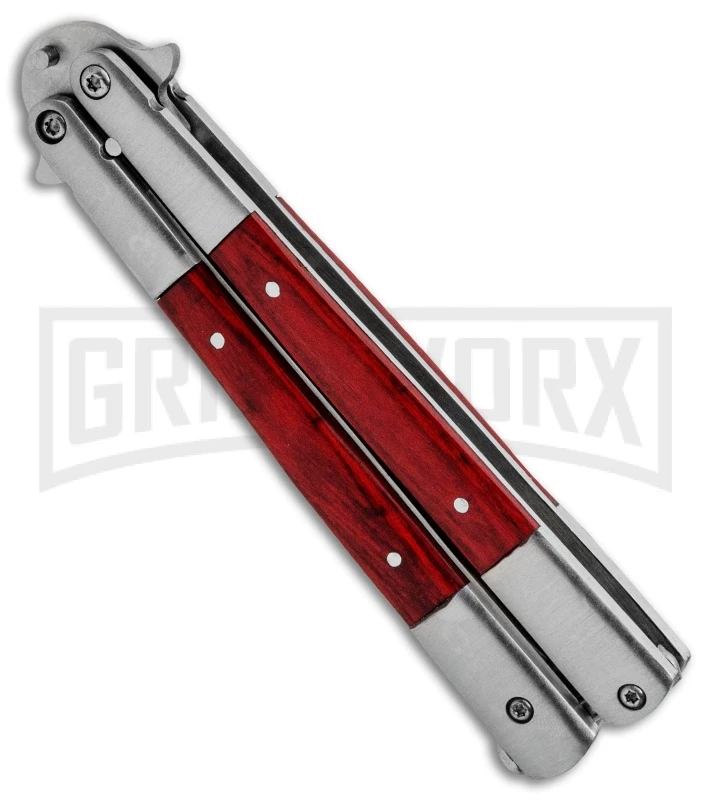 The Regal Red Wood butterfly knife has solid, smooth action. It features bolstered steel frame handles with red wood inserts and a pocket clip. The 440 stainless steel, partially serrated clip point blade has two tang pins, which results in tighter lock-up and less blade wear. The knife is constructed with Torx screws for easy adjustment of the knife.