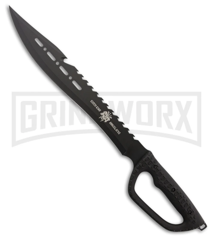 The Renegade Tactical Steel Kudzu King Annihilator is a machete for all your tactical needs. The 420 extended tang stainless steel, clip point blade has a black finish, a sawback, and a cord cutter. The handle is made of black ABS with rubber grip inserts that has a D-shaped guard and lanyard hole. It comes with a black nylon belt sheath with an adjustable nylon shoulder strap.
