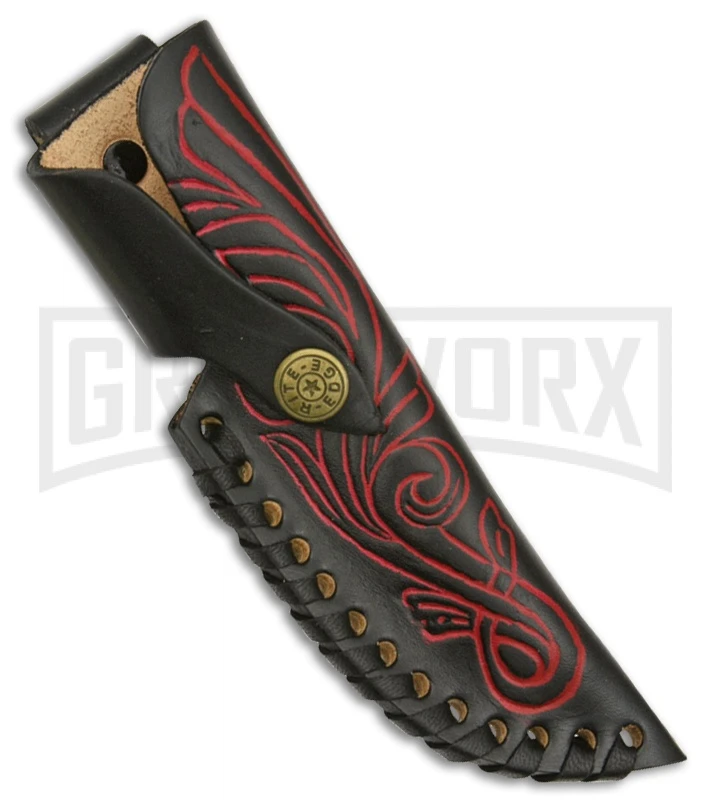 The Rite Edge Whitetail Husk is a fixed blade knife that will allow you to hunt in style and get the job done, all at the same time. This damascus steel knife has a drop style blade with fileworking on the spine. The handle is a round design made from stag with a brass guard and pommel. You have the ability to carry this through the woods with the black leather belt sheath with embossed red trim.