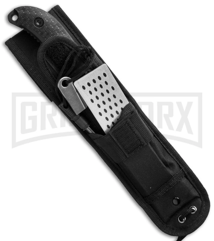 The SCHF36 is part of Schrade’s Extreme Survival series of knives, which feature tough black powder coated full-tang carbon steel construction with textured black rubber scales. Included with the heavy duty nylon sheath is a ferro rod and sharpening stone. This model has a no nonsense drop point blade.