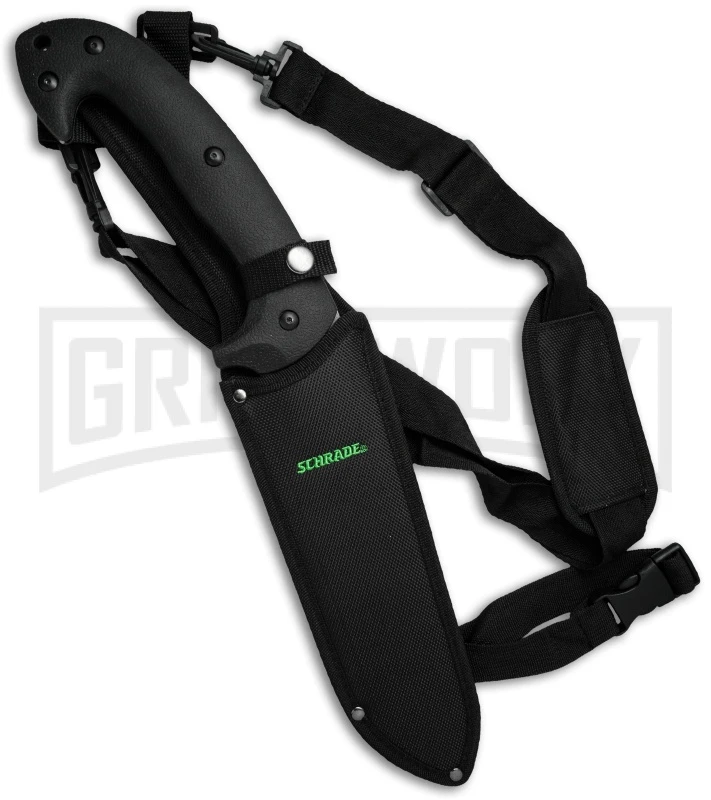 The knife is made with a black coated, full-tang 1070 carbon steel blade with large black TPE handle scales. Includes a polyester sheath and shoulder carry strap.
