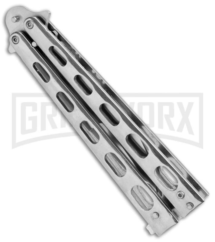 Take your flipping skills to the next level with the Sleek Slinger butterfly knife from Super Knife. This model has silver skeletonized handles and a stainless steel blade with a partially serrated edge. Item includes a T-latch for secure use.
